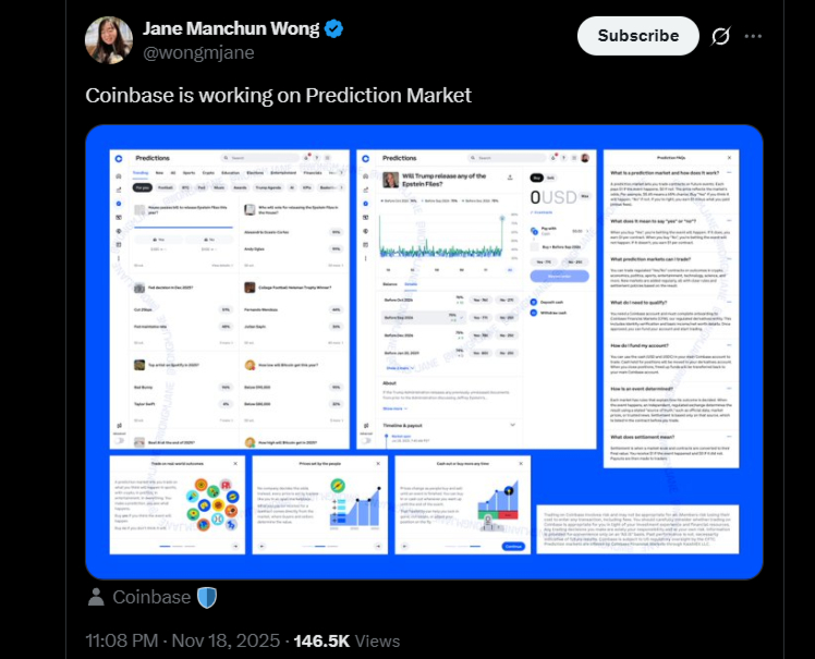 Coinbase is, reportedly, developing a prediction markets platform that will use Kalshi’s regulated infrastructure, according to screenshots uncovered by tech researcher Jane Manchun Wong. The images show a fully designed interface branded with Coinbase’s logo and indicate the platform will be operated through Coinbase Financial Markets, the exchange’s derivatives division.