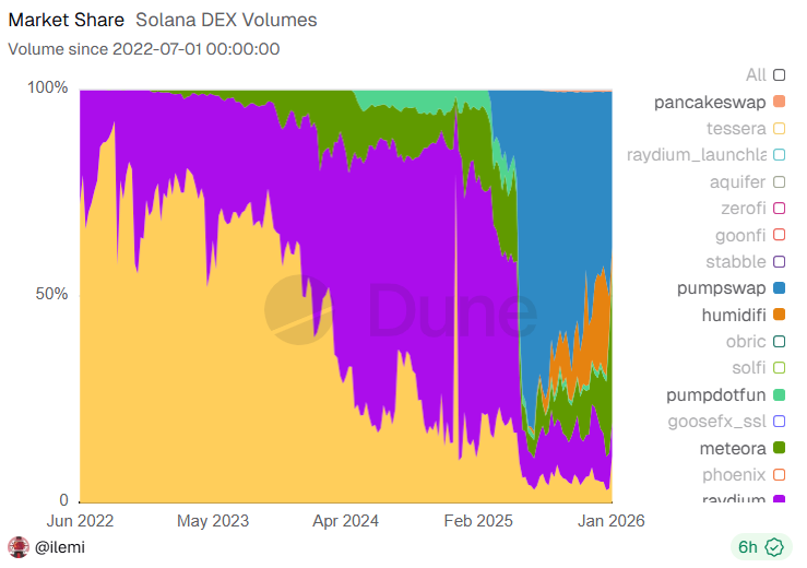 PumpSwap increased its influence, becoming the major Solana DEX in the past few months. | Source: Dune Analytics