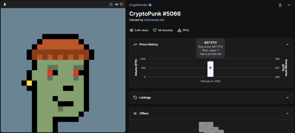 On February 6, 2023, CryptoPunk #5066 became the most valuable NFT ever, selling for an incredible $1.4 million. CryptoPunk #5066 is one of 88 limited edition zombie punks and draws attention with its careful features: a single earring (1 out of 2,459), a knitted cap (1 out of 419), and a smile (1 out of 238). The combination of these attributes has brought it to the forefront of digital art collectors, illustrating the NFT ecosystem’s rising emphasis on odd traits. The record-breaking sale of CryptoPunk #5066 on February 6th shows the growing financial relevance of NFTs. It also exhibits the complex and personalized nature of digital assets in this fast-changing market. However, this record was broken on the very next day.