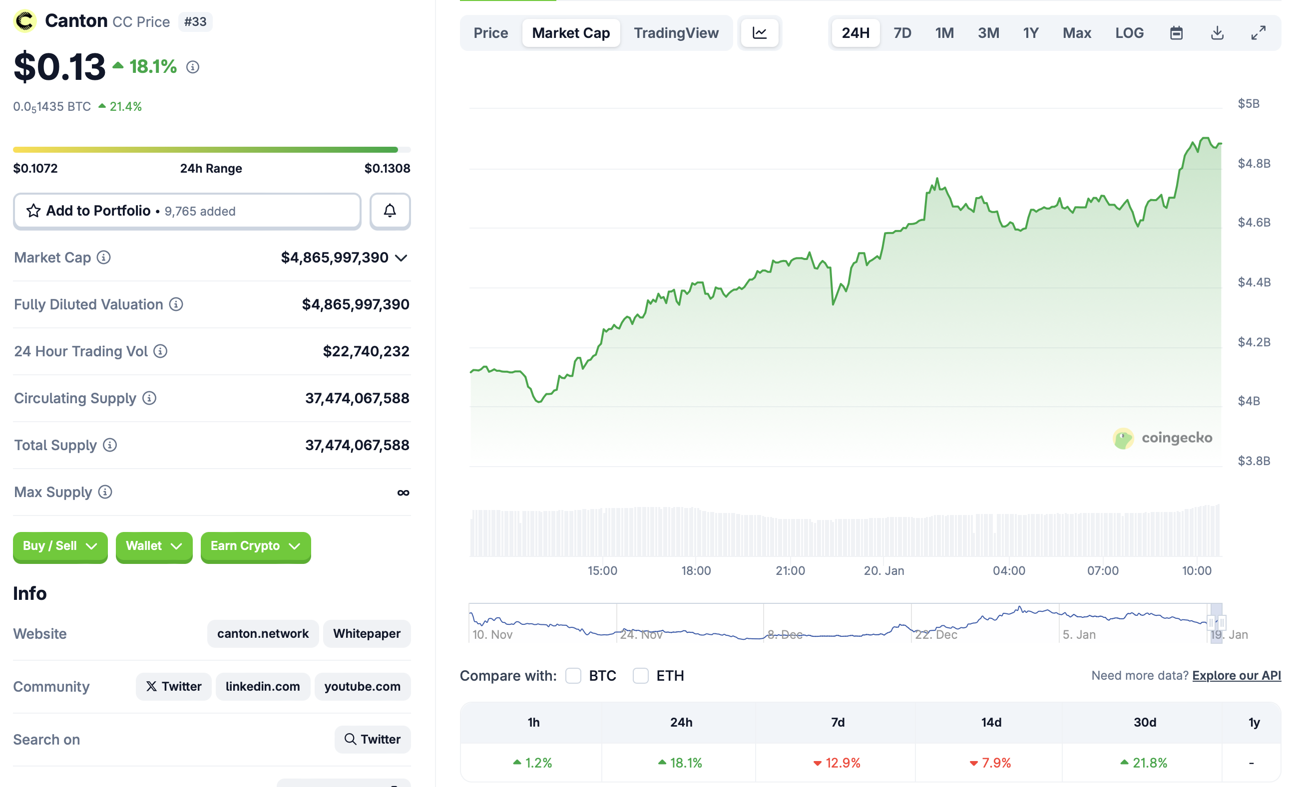 Canton’s native token, CC, has risen in recent weeks. Data from CoinGecko shows the token is up over 20% during the past 30 days and roughly 18% in the last 24 hours.