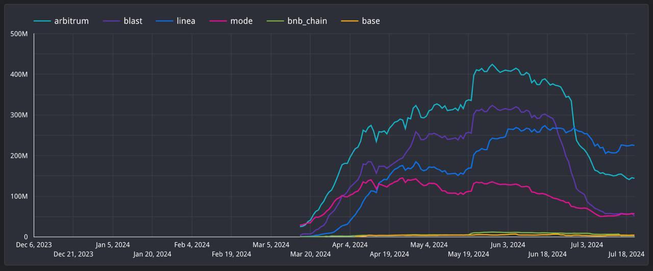 In partnership with Everclear (previously Connext), Renzo protocol sought to bring native restaking to six supported layer-2s: Arbitrum, BNB Chain, Base, Mode, Blast and Linea. Renzo is the third-largest liquid restaking protocol, with $1.2 billion in total value locked (TVL) today.