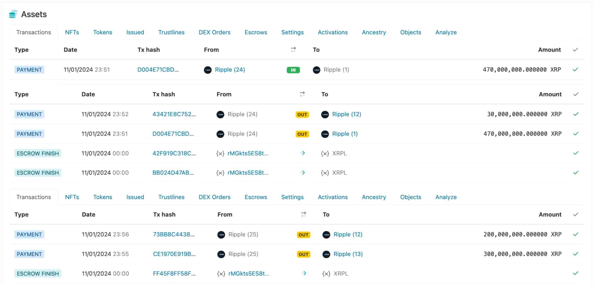 This month’s escrows finished within Ripple (24) and Ripple (25) accounts, unlocking 500 million XRP each, as usual. Ripple (25) re-locked it all in escrows for 2028 within Ripple (12) and Ripple (13) accounts, as usual.