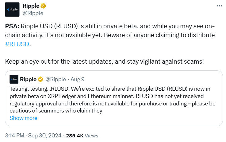 He seized the opportunity to further reiterate that the RLUSD project is not yet live. For context, several bad actors have leveraged the beta testing phase to deceive unsuspecting users, claiming that the RLUSD is now live. Ripple also debunked these claims in a recent post.
