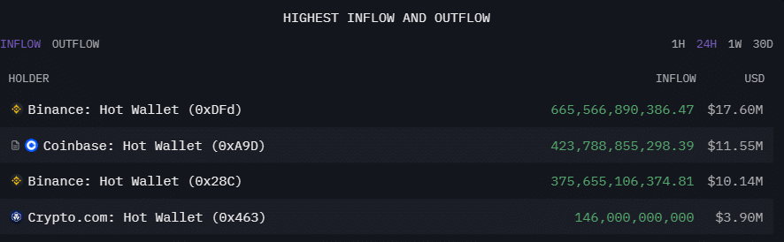 Interestingly, Arkham Intelligence has also indexed multiple whale movements involving exchanges in the last 24 hours, with Binance moving 1.04 trillion SHIB in two transactions, Coinbase transferring 423 billion SHIB, and Crypto.com shuffling 146 billion tokens within this timeframe.