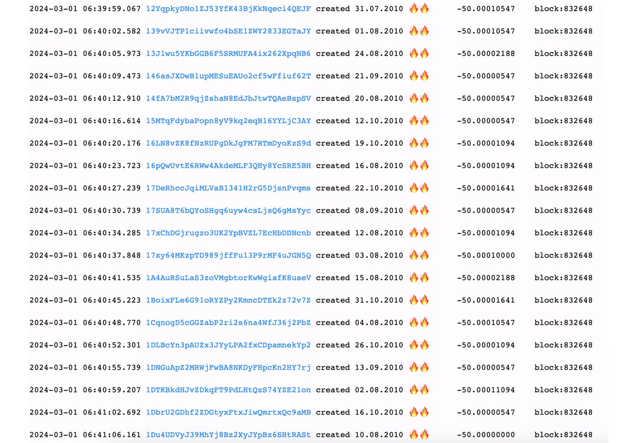 On March 1, 2024, the notorious mega whale, initially detected on March 11, 2020, executed transfers of 2,000 BTC from 2010 through approximately 40 separate transactions. Each transaction involved a 50 BTC coinbase reward originating from 40 unique Pay-to-Public-Key-Hash (P2PKH) addresses. The whale last made an appearance on Dec. 5, 2023.