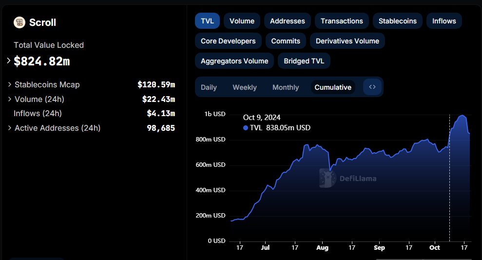 DefiLlama data shows that between October 9 and October 16, Scroll’s TVL jumped by $157.70 million. It moved from $838.05 million to $995.75, signifying a surge of almost 20% in a week. However, the spike in Scroll’s TVL was short-lived. It has been dropping since the days leading up to the snapshot, recording $824.82 million as of writing.