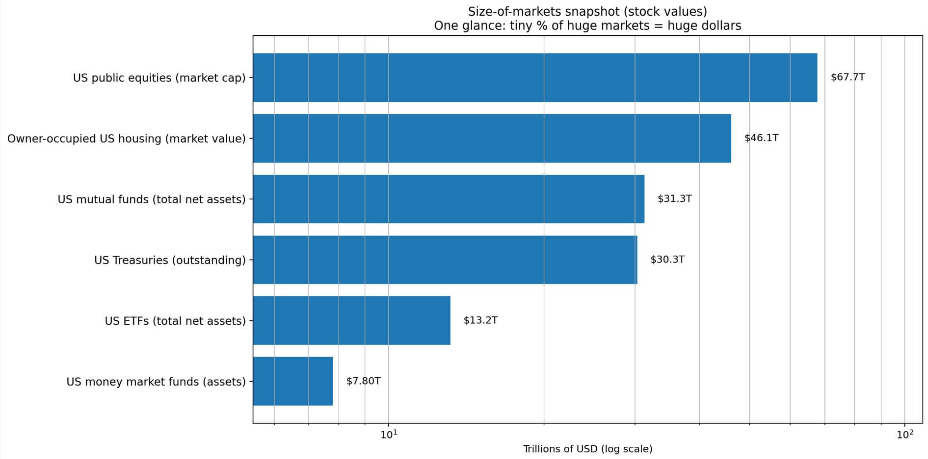 Even at 1% adoption across Treasuries, money market funds, and equities entitlements, that’s over a trillion dollars in on-chain representation.