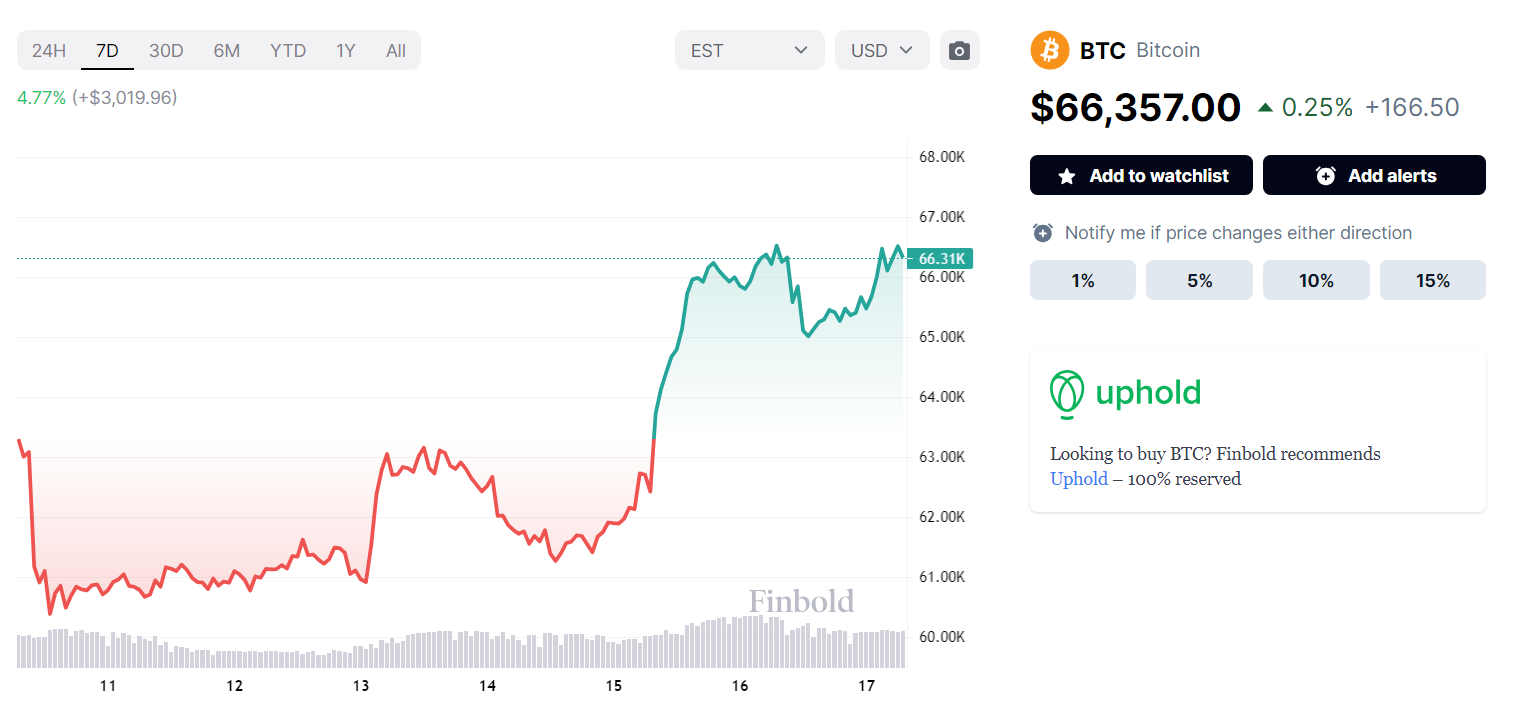 By the middle of the month – and particularly after the latest CPI report came out lower than was feared – the world’s premier cryptocurrency again took off, gaining nearly 5% in a week and surging from a low near $60,000 to a press time price of $66,357.