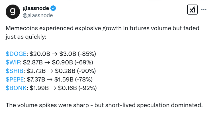 These patterns suggest that speculation played a key role in driving up futures volume across the meme coin sector.