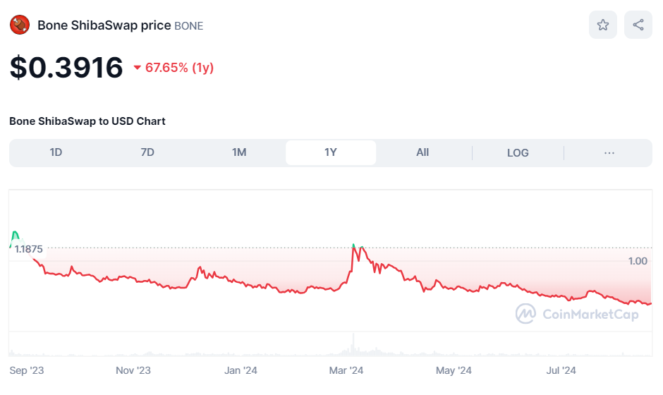 BONE currently trades at $0.3925, representing a decline of over 8% in the past week. Looking at a broader time frame, the token has plummeted by 27% in the last 30 days and a staggering 68% over the past year.