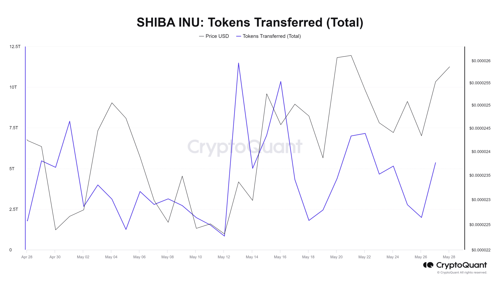 According to CryptoQuant data, on May 27, investors deposited 1.462 trillion Shiba Inu tokens to exchanges, the largest figure in nearly a week. This resulted in a positive exchange netflow of 607 billion SHIB tokens that day.