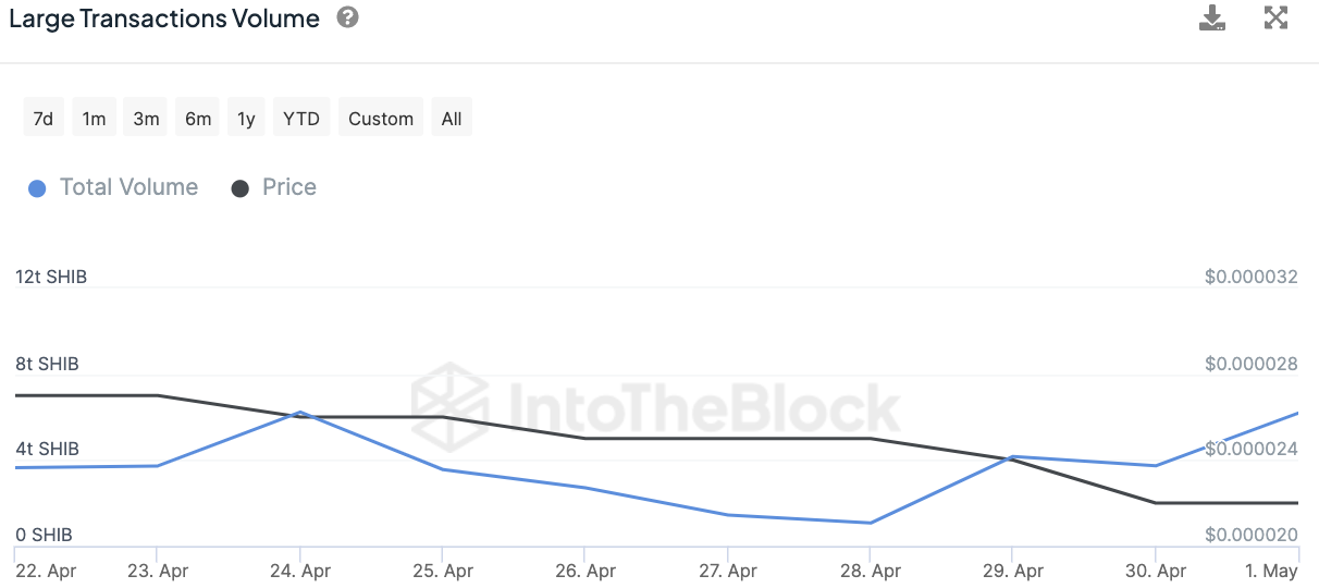 It has come to light, thanks to data from IntoTheBlock, that the volume of large transactions involving the popular meme cryptocurrency Shiba Inu (SHIB) has increased 165% in the past 24 hours from 3.73 trillion SHIB to 6.18 trillion SHIB.