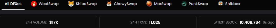 Punkswap and Chibbex have seen paltry volumes of $20 and $6, respectively. Other Shibarium-based decentralized exchanges, including DogSwap, Woof, and LeetSwap, have less than $10 combined in daily trading volume. According to data from DexScreener, the volumes across these DEXes bring the total to around $17,000.
