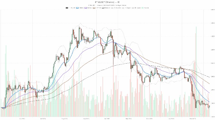 $ETH/$USDT — daily chart with candlesticks, EMA20/EMA50 and volume.