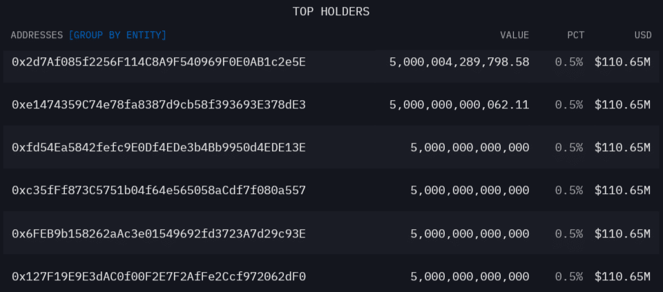 Amid persistent market trends, The Crypto Basic analysis from Arkham Intelligence has identified a notable pattern among top SHIB holders. Specifically, data shows that six Shiba Inu wallet addresses each possesses precisely 5 trillion tokens, valued at $110.70 million based on current exchange rates.