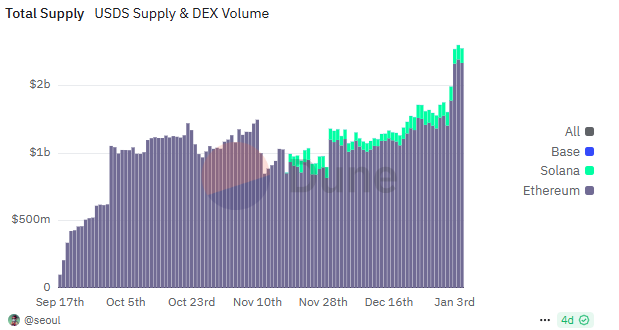 The new supply milestone arrived after USDS surpassed 1.5B tokens as of January 3. The token expanded in the first days of the new year, reaching peak supply with rapid growth on Ethereum and smaller additions on Solana.