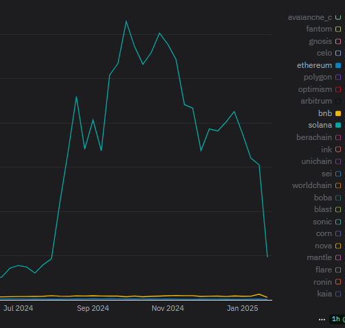 The shift to BNB Smart Chain happened after Changpeng ‘CZ’ Zhao’s increased social media presence had an outsized effect on the platform’s new token launches. DEX activity has also grown in the past months as more users have flocked to PancakeSwap. After the shift in activity, BNB DEX carried over $2.34B in traffic, starting to catch up with Solana. In hindsight, Solana DEX traffic peaked in October 2024 and is now returning to baseline.