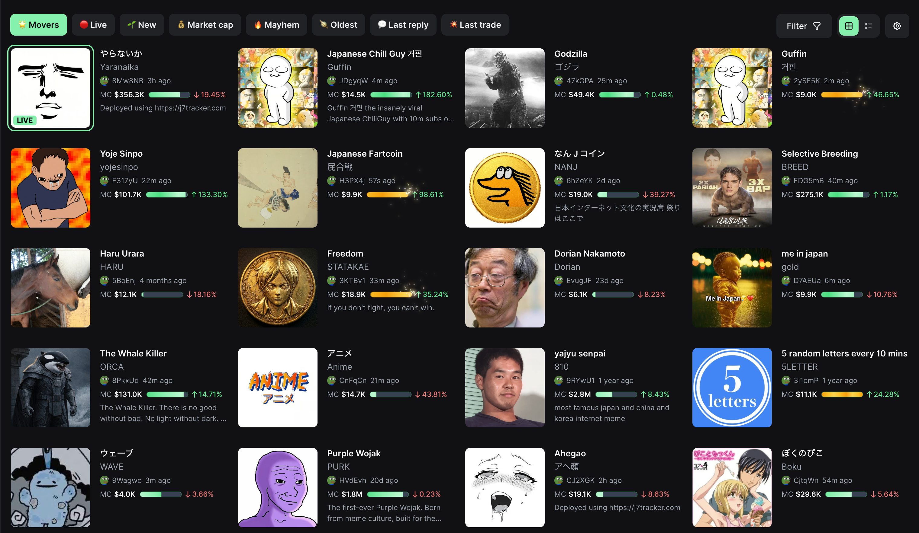 Japan-focused and anime-based tokens seemed to be the flavor for new token issuances in Asian afternoon hours on Tuesday, though these themes can rapidly change based on newer narratives or demographics of users most using the platform at any given time.