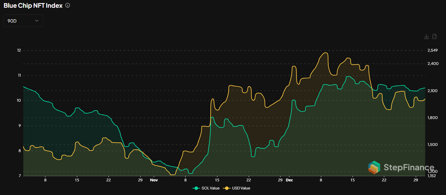 The Solana blue chip index expanded in December, to over 10 SOL on average for the sales of top NFT collections. | Source: Step Analytics