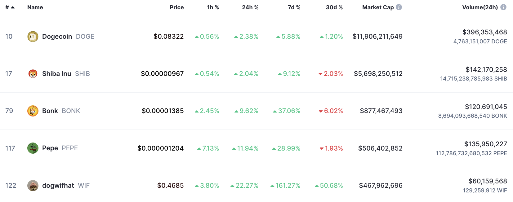 But what truly captures attention is Dogwifhat’s meteoric rise among the meme coin elites. Surpassing heavyweights like FLOKI and MEME, Dogwifhat now stands proudly among the top five meme coins by market capitalization. Its newfound neighbors in this elite ranking include the likes of Dogecoin (DOGE), Shiba Inu (SHIB), Bonk Inu (BONK) and PepeCoin (PEPE).