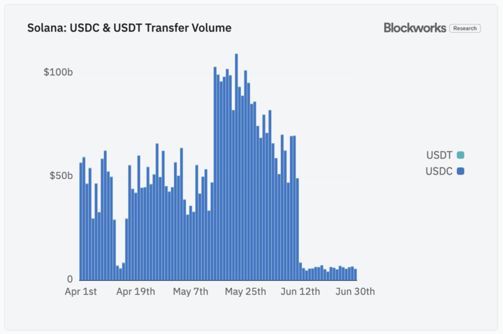 Blockworks Research data shows a single wallet address — carrying out market making activities on Phoenix — accounted for nearly 50% of Solana stablecoin transfer volume in May and part of June. I confirmed with Phoenix Developer Ellipsis Labs that this single Phoenix market maker was responsible for the large transfer volume.