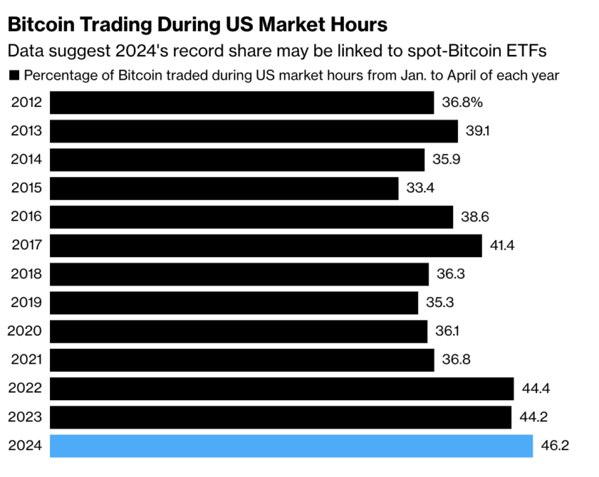 Bitcoin trading during US market hours has surged to unprecedented levels, accounting for 46% of this year’s cumulative volume from January to April.