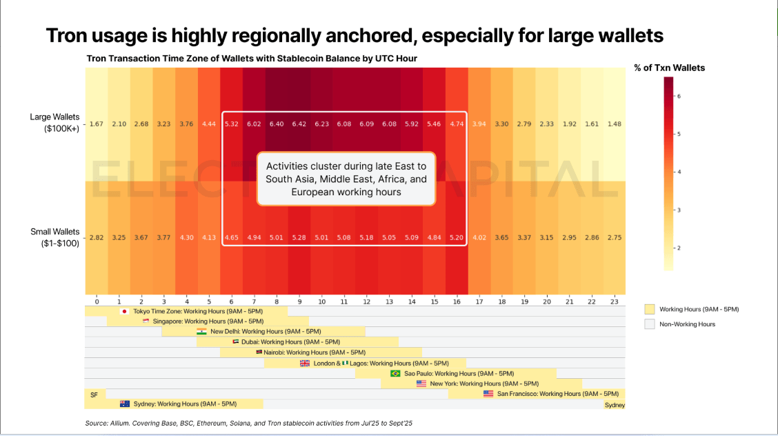 “BSC and Tron show remarkably similar patterns, with activity concentrated between UTC 6–15—aligning with working hours across Asia, the Middle East, and Europe. Both chains see less than 3% of activity during U.S. hours, indicating minimal relative Western adoption despite their large overall user bases,” the report notes.