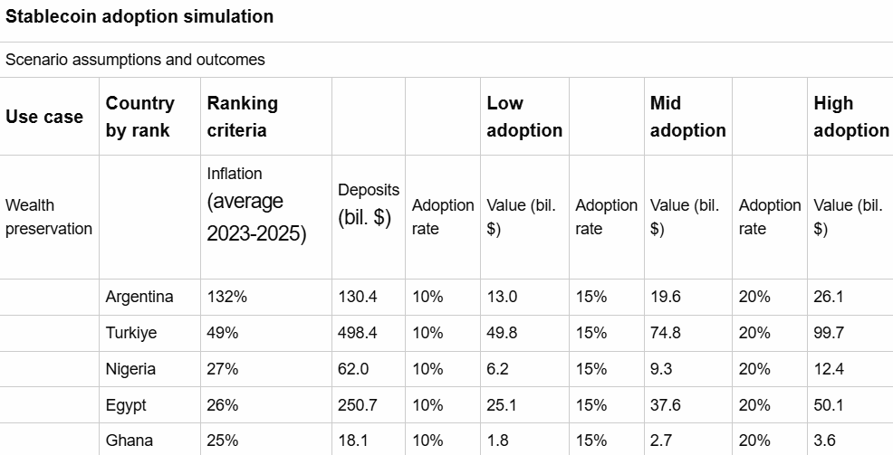 “We assume stablecoin adoption could reach 10-20% of bank deposits in the top 15 countries where wealth preservation (purchasing power) is the most important factor,” the report notes.