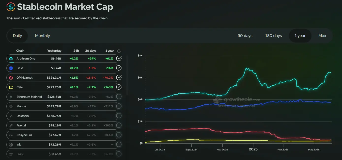 Stablecoins returned to Arbitrum, one of the most active L2 chains for DeFi. | Source: GrowThePie