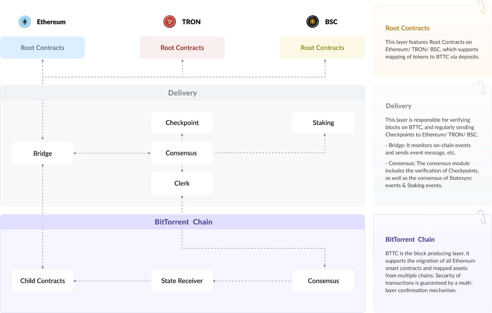• Root Contracts (Staking Layer). This layer manages smart contracts on chains like TRON, Ethereum and BNB Chain. These contracts use token mapping to link tokens from these chains to BTTC through deposits and allow BTTC to support over 100 different tokens via the BTTC Bridge.