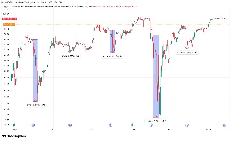 Historically, ex dividend price declines have seen price declines by as much as 2% with frequent recoveries back toward par, seen in October and December. However, after the August and November dividend dates, STRC experienced price drops of over 6%, driven by broader volatility, before eventually rebounding.