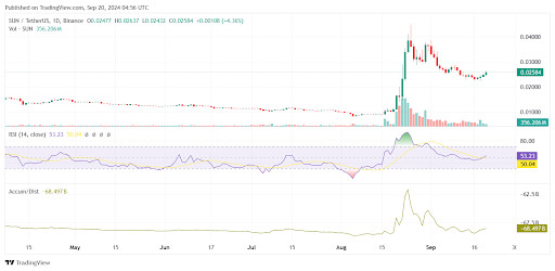 The Relative Strength Index (RSI) for the SUN token currently sits at 53.23, which confirms that the bulls are in control of the price action of the cryptocurrency, and the gradient of the line suggests that higher prices will follow. Further, the accumulation of the token has dipped, but a slight uptick suggests a trend reversal as well.