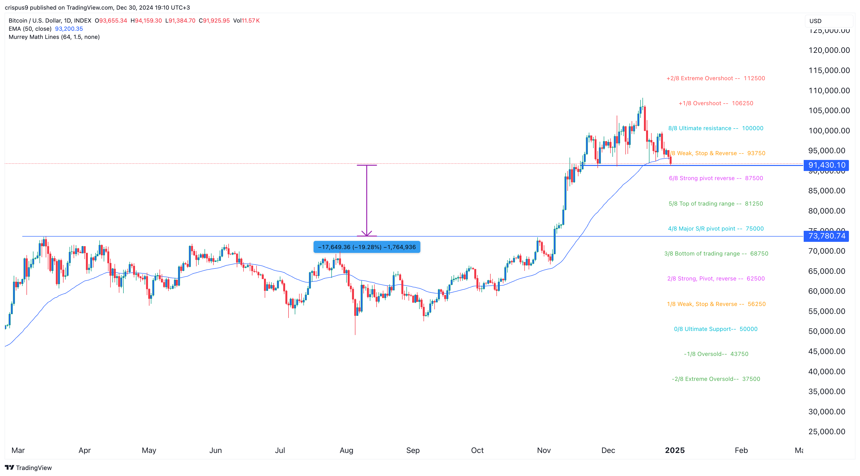Additionally, Bitcoin appears to have formed a head and shoulders pattern, a widely recognized bearish reversal indicator. It has also dropped below the weak, stop & reverse point of the Murrey Math Lines at $93,750.