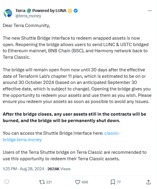 Terra urged users to redeem their tokens promptly and set a clear deadline tied to Terraform Labs’ Chapter 11 plan, which projected a closure around October 30, 2024. This reopening aimed to facilitate a smooth asset transition, ensuring no funds remained stranded in bridge contracts after closure.