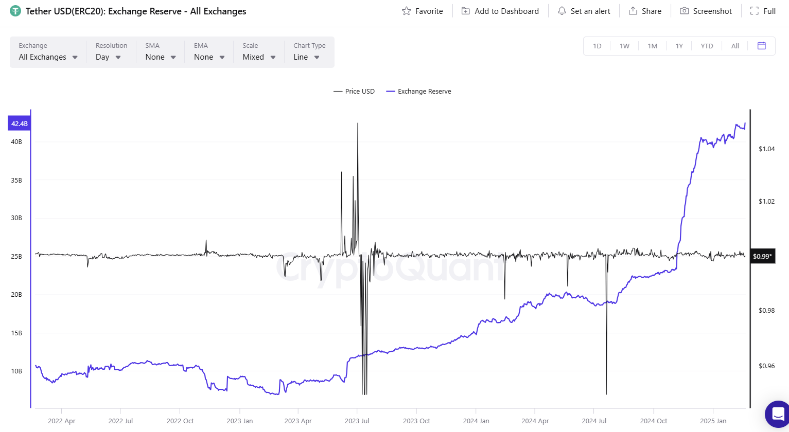 Exchanges hold peak USDT reserves, though the biggest inflows went to derivative exchanges, most prominently Binance. | Source: Cryptoquant