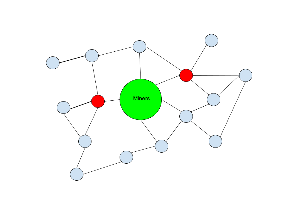 Let’s look at a simplified example of different network node compositions. In the following graphics blue nodes represent ones that will propagate some arbitrary class of consensus valid transactions, and red nodes represent ones that will not propagate those transactions. The collective set of miners is denoted in the center as a simple representation of where transacting users ultimately want their transactions to wind up so as to eventually be confirmed in the blockchain.