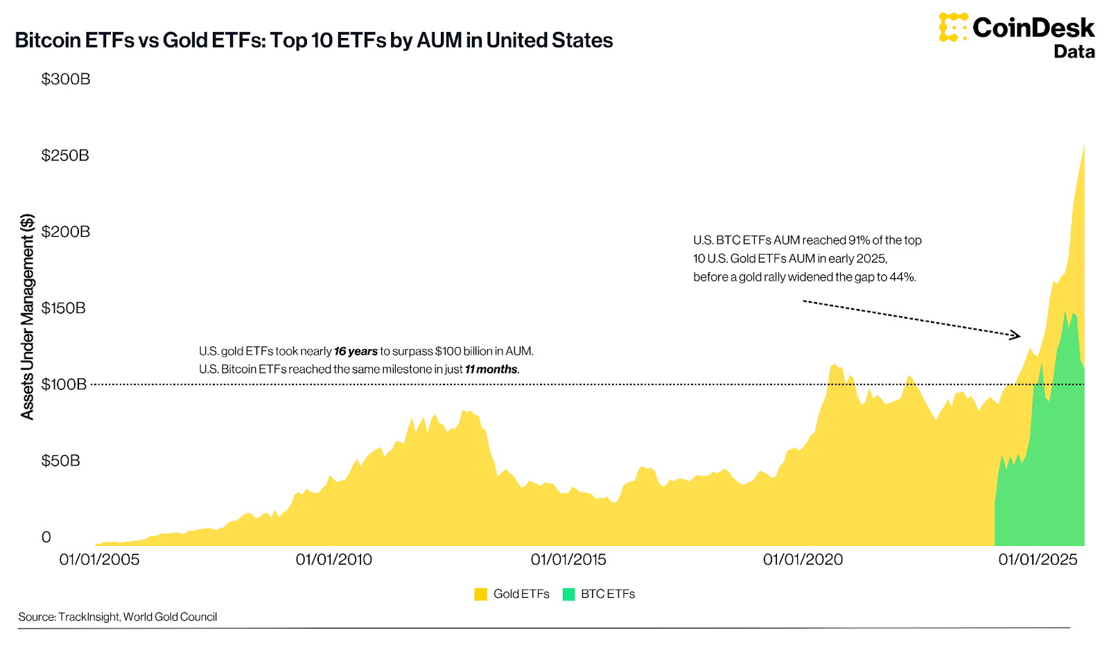 The pace of adoption has also been unusually fast when compared to earlier ETF cycles. U.S. bitcoin ETFs reached $100 billion in assets in just 11 months, while U.S. gold ETFs took nearly 16 years to surpass the same milestone. By early 2025, bitcoin ETFs had matched 91% of the top 10 U.S. gold ETFs by AUM, before gold’s subsequent rally widened the gap. This is less a statement about relative value and more a statement about how quickly bitcoin has been absorbed into institutional distribution channels once the wrapper became available.
