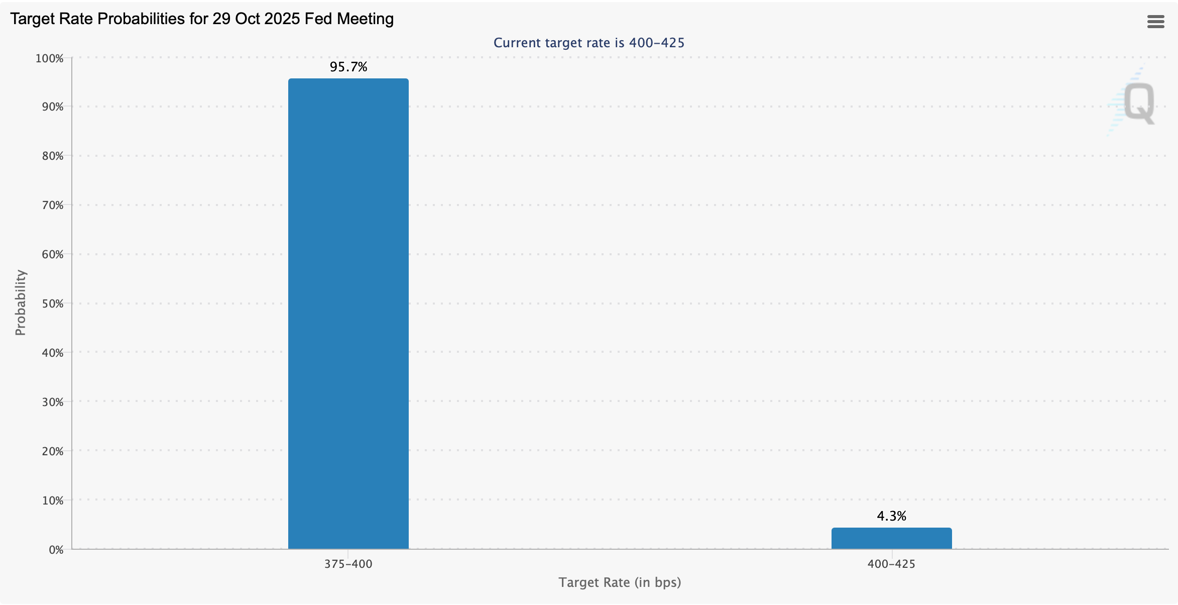 CME’s FedWatch tool shows a 95.7% probability of a quarter-point cut and 4.3% odds of no change.
