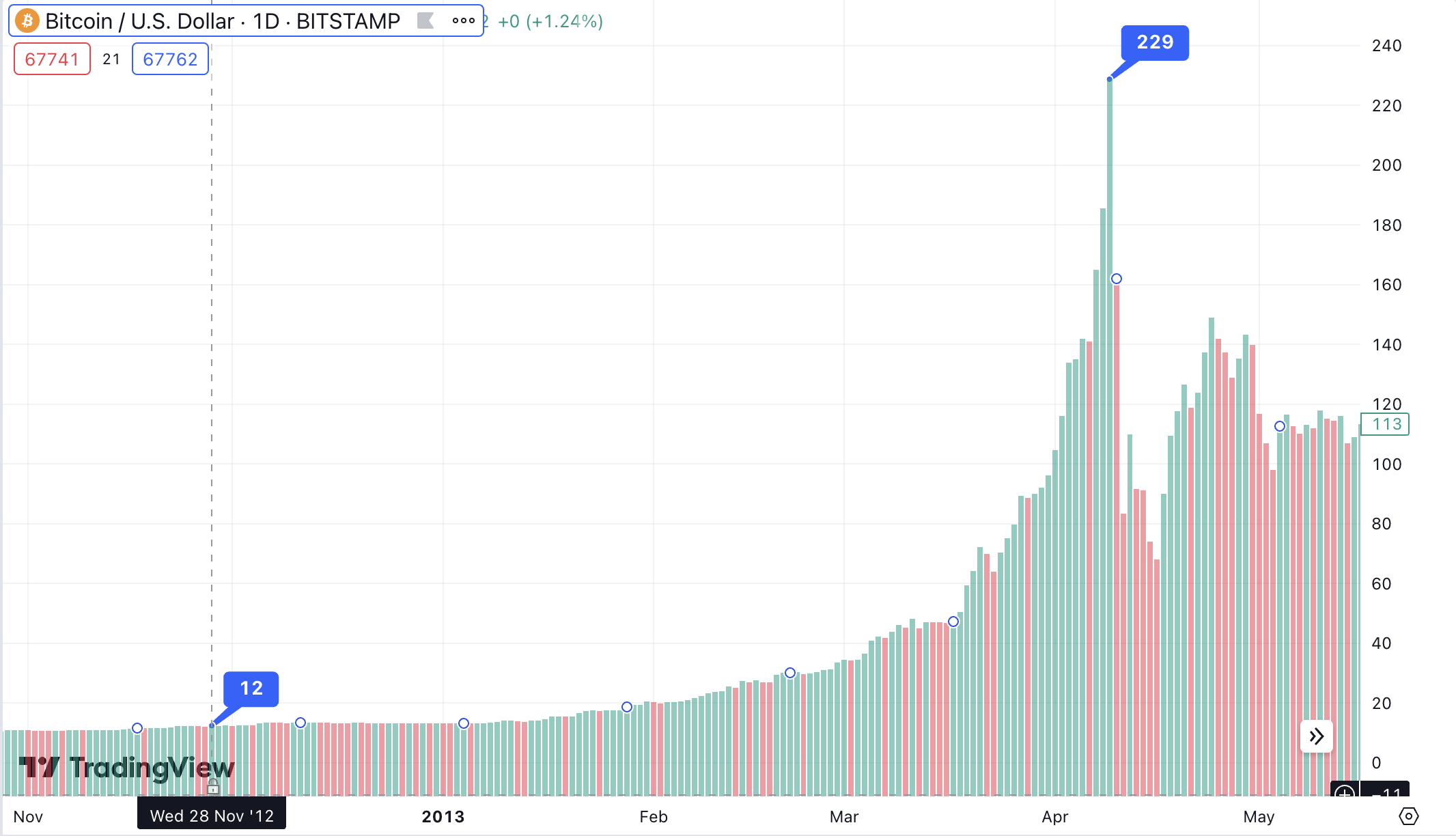 Bitcoin, which had been trading for around $12 in the lead-up to the first halving in November 2012, jumped to $229 by April 2013, then climbed to roughly $1,132 by the following November, according to TradingView.