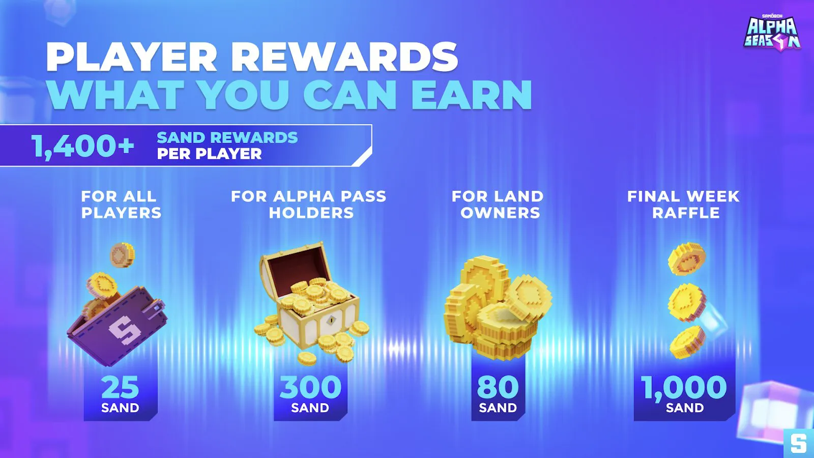 Overall rewards in this season include 25 SAND through the Battle Pass for regular players. While an additional 300 SAND for the Alpha Pass holders. Landowners can earn up to 80 SAND depending on the total EP earned by the community.