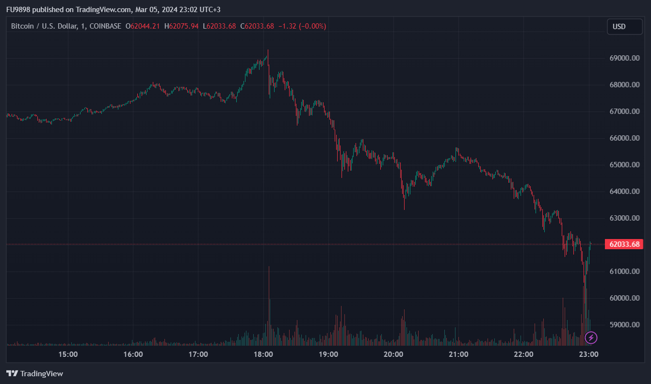 The sudden decline after the new record of $ 69,324 on Coinbase resulted in a loss of more than 12% at the time of writing, and BTC is currently traded at $ 60,414.
