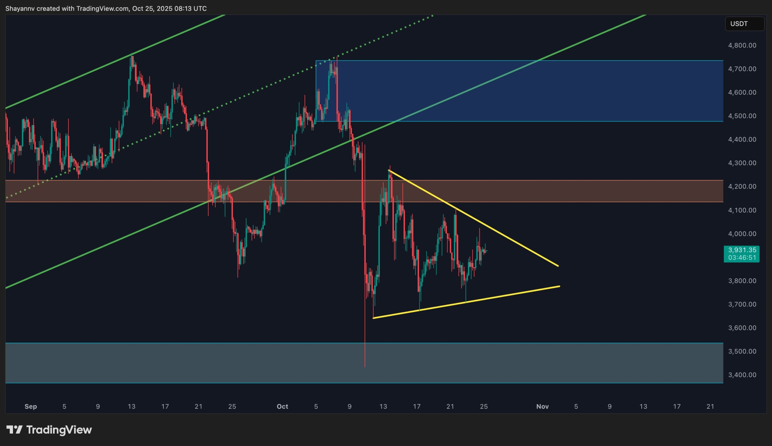 This compression pattern signals a liquidity buildup phase, where traders are positioning ahead of a potential volatility expansion. If bulls manage to push above the upper trendline, a rally toward $4.1K and potentially $4.6K could follow. Conversely, a breakdown below $3.7K would expose the $3.4K demand zone once again. Until confirmation, Ethereum is likely to continue oscillating within this narrowing range — a setup that typically precedes a sharp directional breakout.