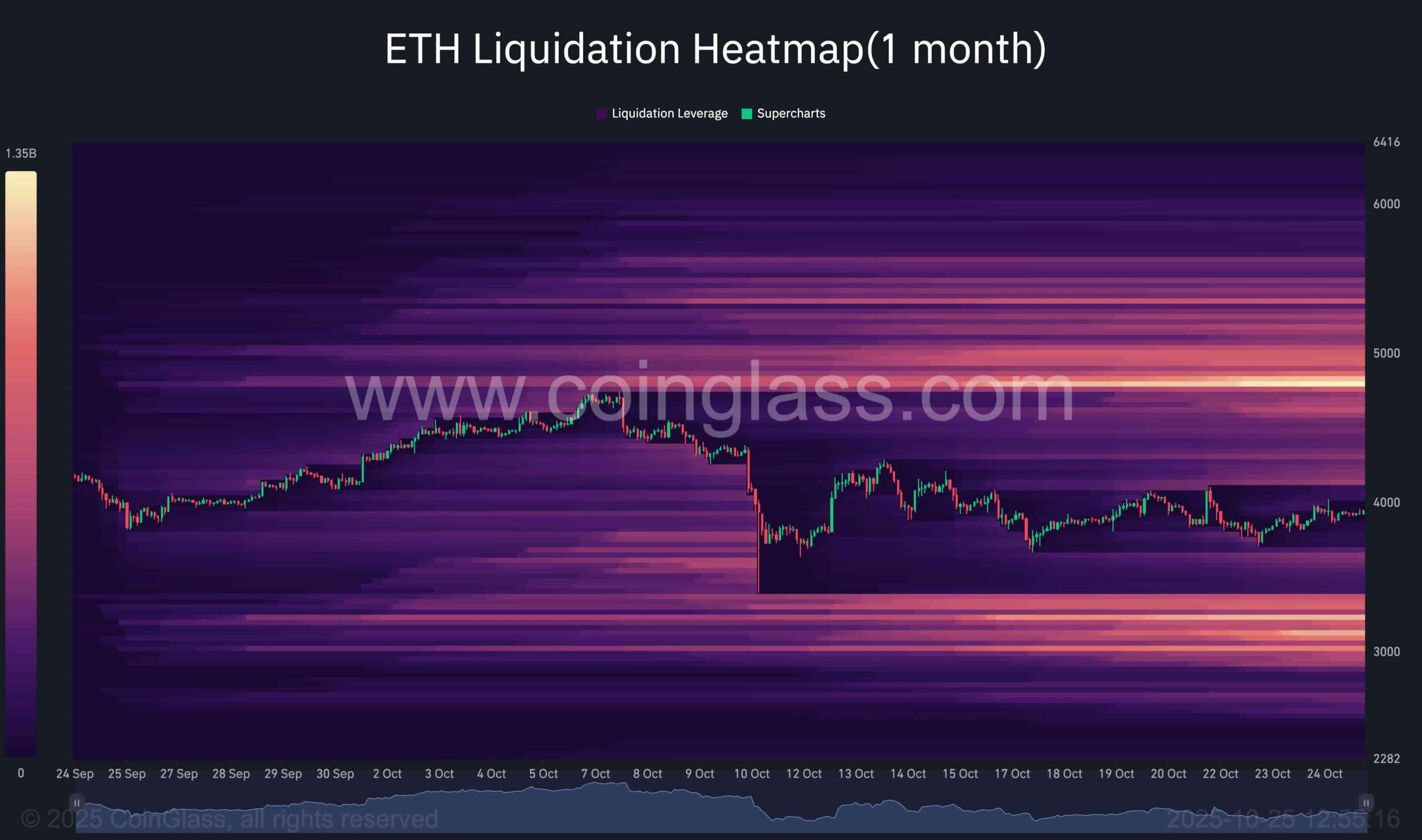 The 1-month liquidation heatmap for Ethereum reveals a dense liquidity pocket forming above the $4.8K swing high, situated directly beyond the current symmetrical consolidation structure. This area corresponds to a significant cluster of resting short liquidations, implying that if Ethereum reclaims the mid-range near $4.1K–$4.3K, a rapid move to absorb this overhead liquidity could follow.