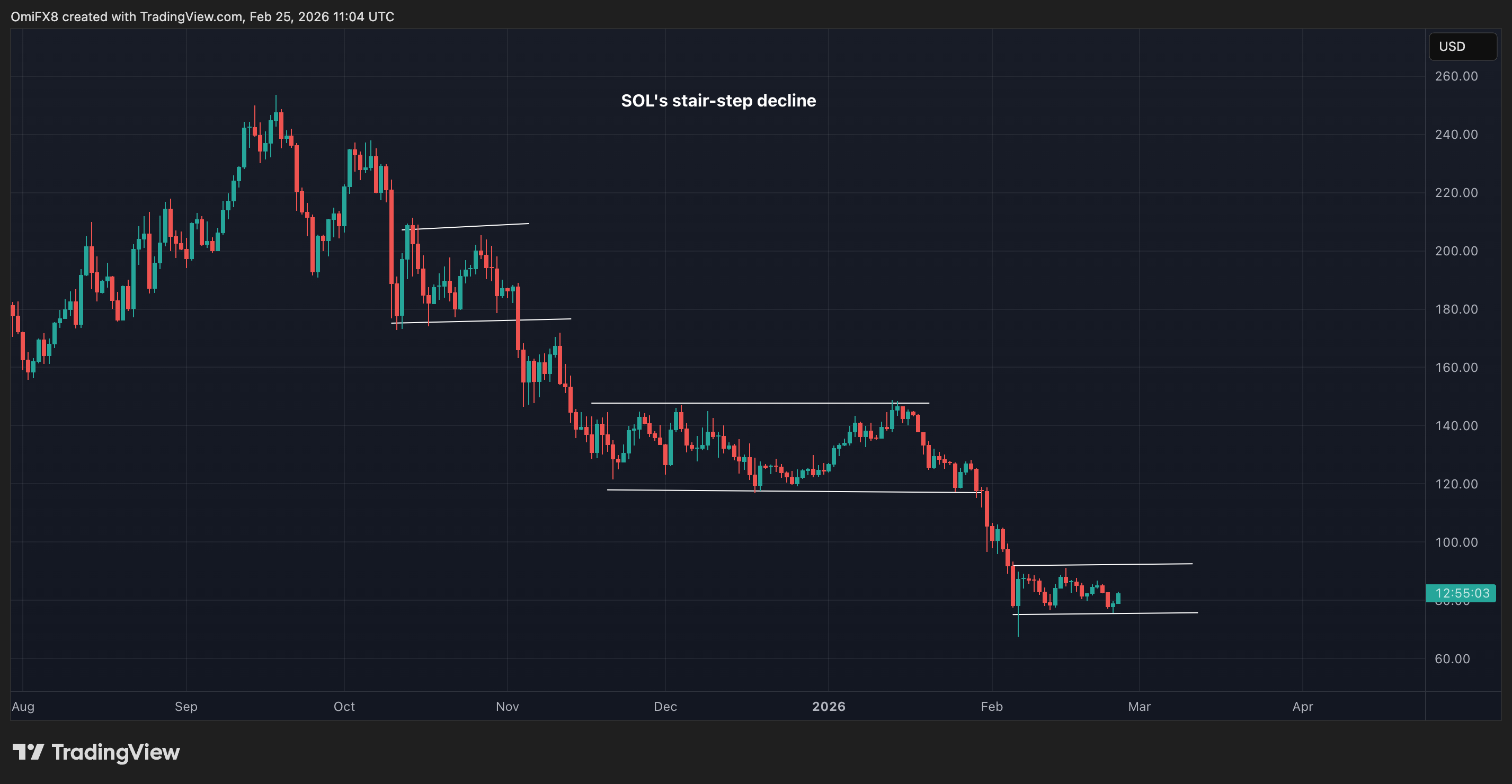 - The chart shows daily price swings in solana ($SOL) in candlestick format.