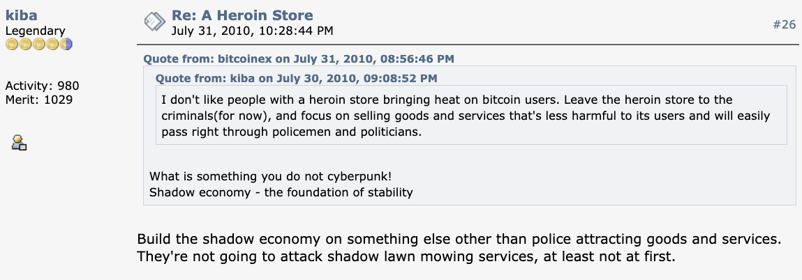 Teppy was clear that it was all hypothetical; he was not planning to start a heroin store. It was enough cover for a number of early high-profile Bitcoin users to join in on the experiment, including Laszlo Hanycez, Martti Malmi, Michael Marquadt, Bruce Wagner, Mike Caldwell and more.