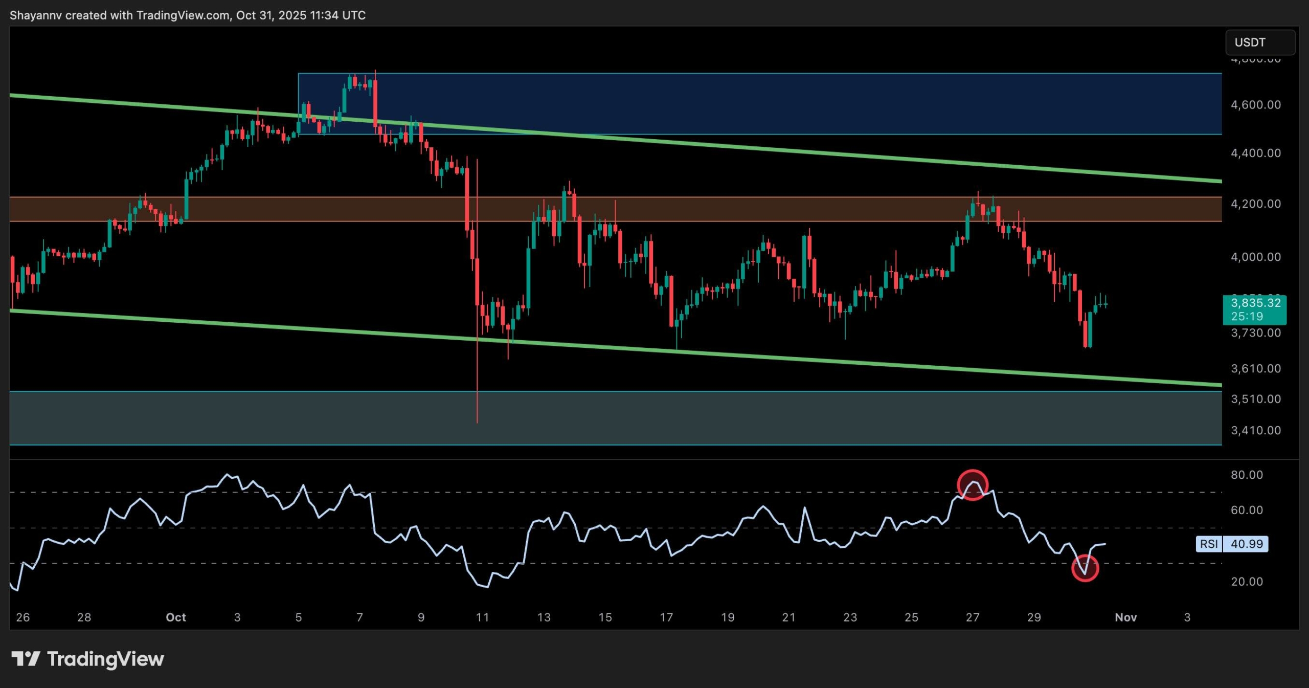 On the 4-hour chart, the picture becomes more granular. After the recent rejection from $4,200, ETH saw a sharp drop into the lows of the range, which was swept before a small bounce emerged. The price is currently hovering around $3,800 and attempting to reclaim momentum. The RSI also hit oversold territory and has now started turning up, indicating a potential short-term relief rally or range-bound consolidation.
