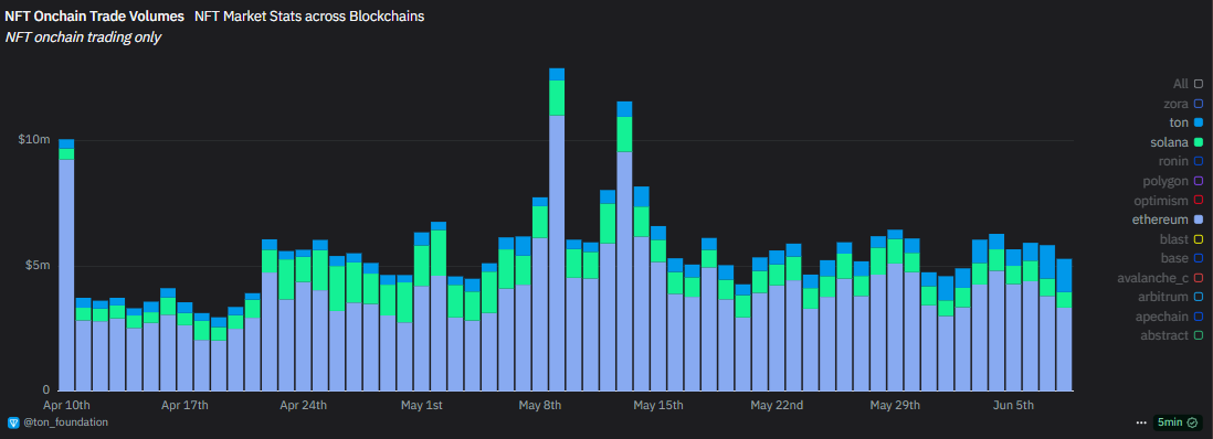 TON often gets ahead of Solana, though still lagging behind the on-chain NFT swaps on Ethereum. Telegram Collectible Gifts can also be swapped off-chain, with even higher activity and trading volumes. | Source: Dune Analytics