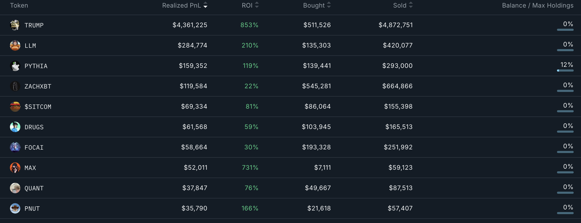 In the past 90 days, this wallet has traded 105 different tokens, with 13 of them yielding returns above 100%. It has realized significant profits, including $284,774 in LLM and $159,352 in PYTHIA.