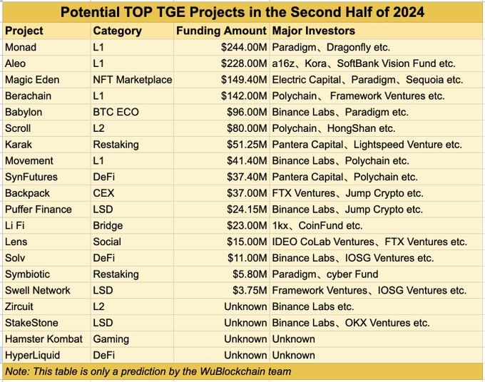 Top Crypto Projects with Potential TGEs in H2 2024. Source: X/WuBlockchain
