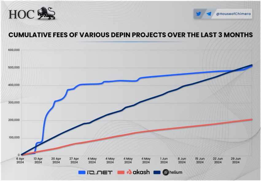 Recent data from House of Chimera indicates that io.net (IO), Helium (HNT), and Akash Network led in fee generation over the past three months. Io.net and Helium each amassed $500,000 in fees, and Akash Network followed with over $200,000.